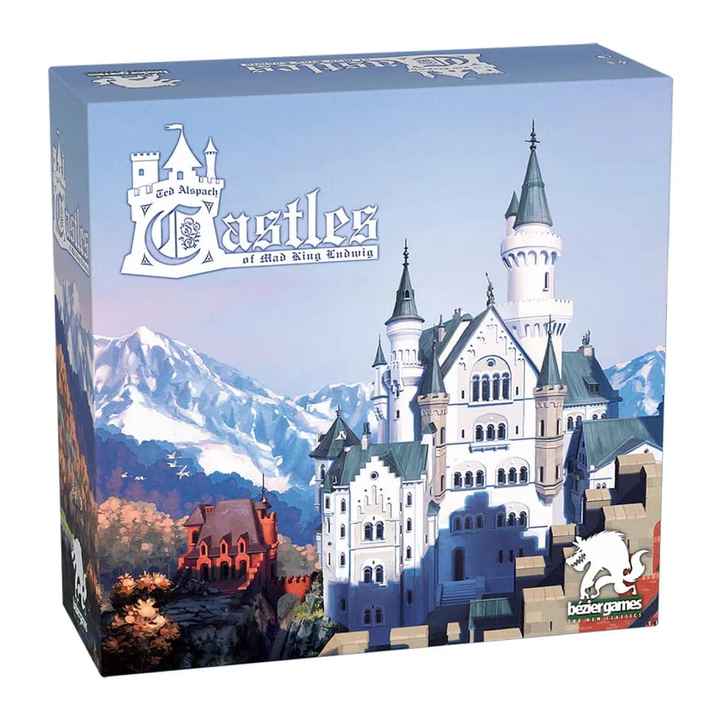 In the tile-laying game Castles of Mad King Ludwig, players are tasked with building an amazing, extravagant castle for King Ludwig II of Bavaria…one room at a time. You see, the King loves castles, having built Neuschwanstein (the castle that inspired the Disney theme park castles) and others, but now he’s commissioned you to build the biggest, best castle ever — subject, of course, to his ever-changing whims. Each player acts as a building contractor who is adding rooms to the castle he’s building while also selling his services to other players.